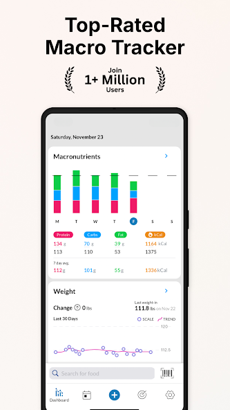 • Gunakan pelacak kalori makanan MacrosFirst , pelacak nutrisi, dan pelacak makanan untuk menetapkan tujuan makro harian khusus dan mencatat makanan tak terbatas untuk setiap diet atau rencana penurunan berat badan dengan kalkulator makro canggih kami.
